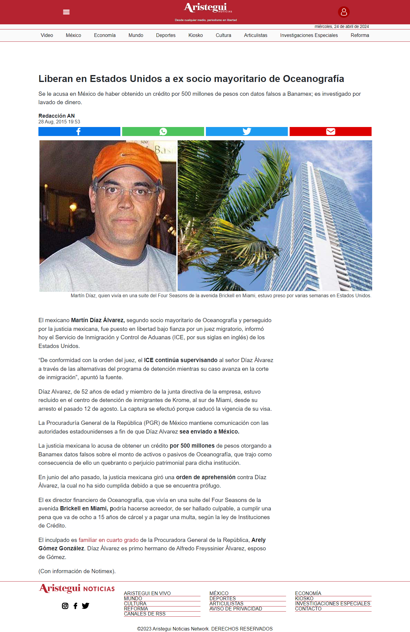 Liberan en Estados Unidos a ex socio mayoritario de Oceanografía