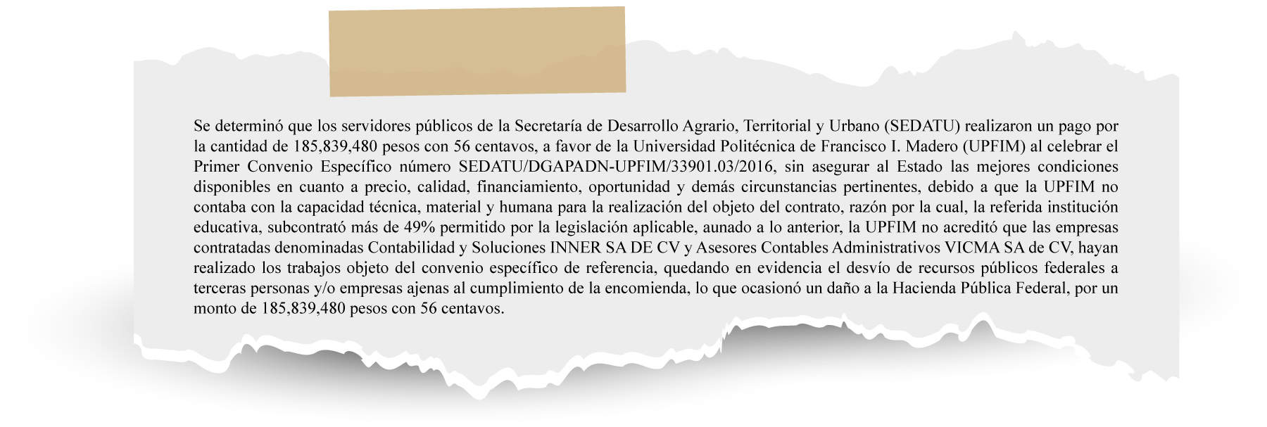 En octubre de 2018 la ASF presentó una denuncia de hechos en relación con la auditoría forense 196-DS, denominada Convenios de Coordinación, Colaboración y Acuerdos Específicos Suscritos con la Administración Pública Federal para el Desarrollo de Diversos Proyectos, Adquisiciones y Otros Servicios, la cual se efectuaría a partir del 3 de mayo de 2017 en la Universidad Politécnica de Francisco I. Madero (UPFIM), para hacer el padrón y manuales de gestión de programas de la SEDATU, y presuntamente no se llevaron a cabo los servicios, pero sí recibieron recursos que luego entregaron a cuentas de proveedores y distintos funcionarios en 2016 y forman parte de las irregularidades observadas.