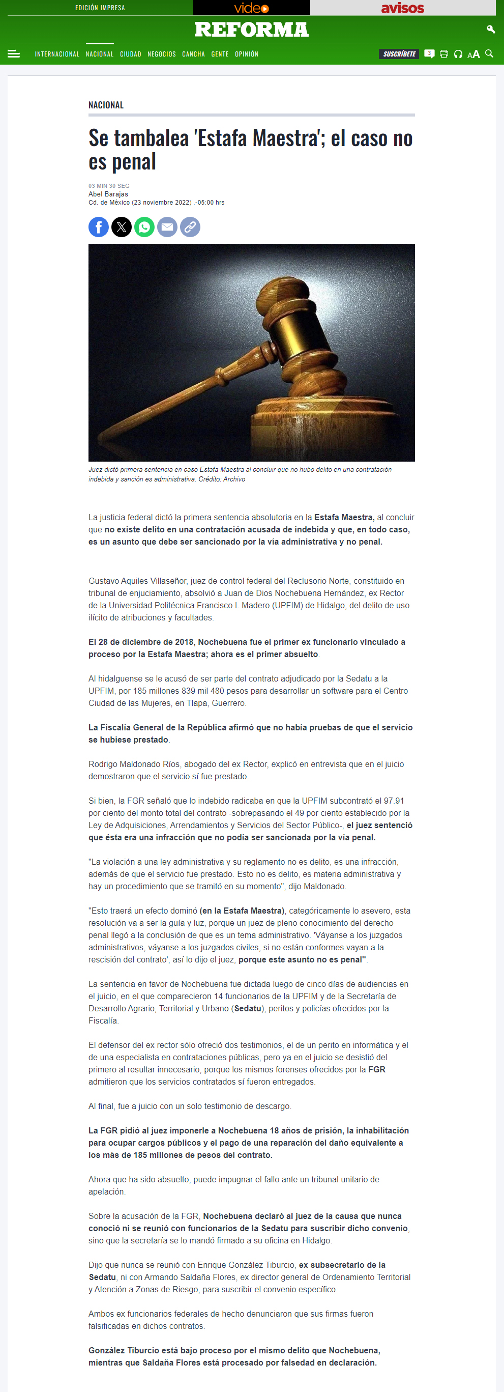 En noviembre de 2022 vino el primer golpe al corazón de este caso emblemático de corrupción, cuando el juez de control federal del Reclusorio Norte absolvió al exrector de la UPFIM de Hidalgo del delito de uso ilícito de atribuciones y facultades y dictó la primera sentencia absolutoria al concluir que "no existe delito en una contratación acusada de indebida por 185,839,480 pesos con 56 centavos para desarrollar un software para el Centro Ciudad de las Mujeres en Tlapa, Guerrero, y que es un asunto que debe ser sancionado por la vía administrativa y no penal". Señaló el juzgador que lo indebido radicaba en que la UPFIM subcontrató 97.91% del monto total del contrato, y que esa infracción no podía ser sancionada por la vía penal.